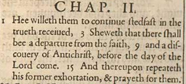 1 Er will, dass sie standhaft in der empfangenen Wahrheit fortfahren, 3 Zeigt, dass da ein Avfallen vom Glauben sein wird 9 und eine Aufdeckung des Antichristen, bevor dem Tag des Herrn kommt. 15 Und wiederholt daraufhin seine vorherige Ermahnung und betet für sie.