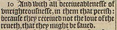 10 And with all deceiueablenesse of vnrighteousnesse, in them that perish: because they receiued not the loue of the trueth, that they might be saued.