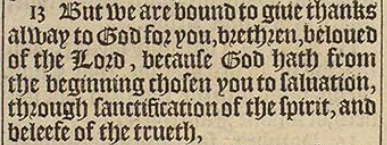 13 But we are bound to giue thanks alway to God for you, brethren, beloued of the Lord, because God hath from the beginning chosen you to saluation, through sanctification of the spirit, and beleefe of the trueth,
