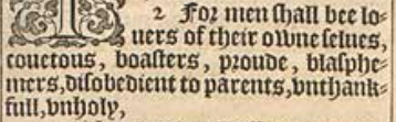 2 For men shall bee louers of their owne selues, couetous, boasters, proude, blasphemers, disobedient to parents, vnthankfull, vnholy,