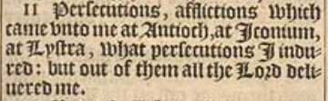 11 Persecutions, afflictions which came vnto me at Antioch, at Iconium, at Lystra, what persecutions I indured: but out of them all the Lord deliuered me.
