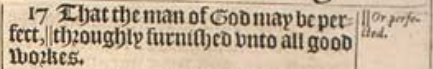17 That the man of God may be perfect, ||throughly furnished vnto all good workes.[||Or, perfected.]