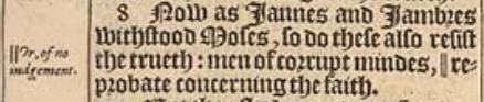 8 Now as Iannes and Iambres withstood Moses, so do these also resist the trueth: men of corrupt mindes, || reprobate concerning the faith.[||Or, of no iudgement.]
