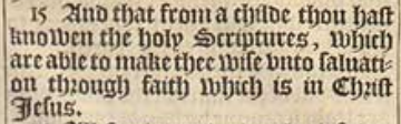 15 And that from a childe thou hast knowen the holy Scriptures, which are able to make thee wise vnto saluation through faith which is in Christ Iesus.