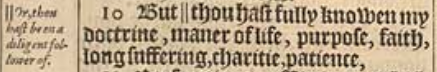 10 But || thou hast fully knowen my doctrine, maner of life, purpose, faith, long suffering, charitie, patience,[||Or, thou hast been a diligent follower of.]