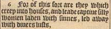 6 For of this sort are they which creep into houses, and leade captiue silly women laden with sinnes, led away with diuers lusts,