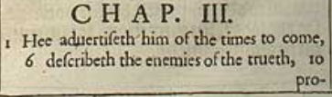1 Er tut ihm kund von den Zeiten die kommen, 6 beschreibt die Feinde der Wahrheit, 10 legt ihm sein eigenes Beispiel vor 16 und empfiehlt die heilige Schrift.