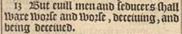 13 But euill men and seducers shall waxe worse and worse, deceiuing, and being deceiued.