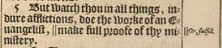 5 But watch thou in all things, indure afflictions, doe the worke of an Euangelist, || make full proofe of thy ministery.[||Or, fulfill.]