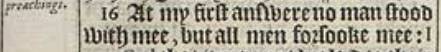 16 At my first answere no man stood with mee, but all men forsooke mee: I pray God that it may not bee laid to their charge.