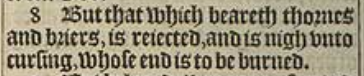 8 But that which beareth thornes and briers, is reiected, and is nigh vnto cursing, whose end is to be burned.