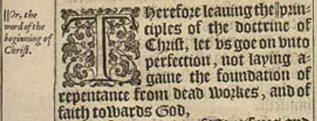1 Therefore leauing the || principles of the doctrine of Christ, let vs goe on vnto perfection, not laying againe the foundation of repentance from dead workes, and of faith towards God,[||Or, the word of the beginning of Christ.]