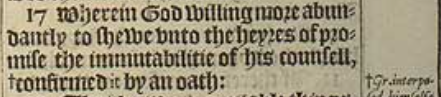 17 Wherein God willing more abundantly to shewe vnto the heyres of promise the immutabilitie of his counsell, +confirmed it by an oath:[+Gr. interposed himselfe by an oath.]