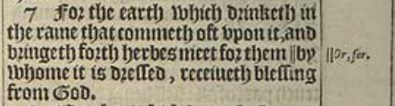 7 For the earth which drinketh in the raine that commeth oft vpon it, and bringeth forth herbes meet for them || by whome it is dressed, receiueth blessing from God.[||Or, for.]