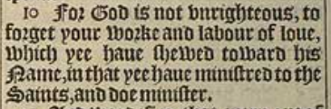 10 For God is not vnrighteous, to forget your worke and labour of loue, which yee haue shewed toward his Name, in that yee haue ministred to the Saints, and doe minister.