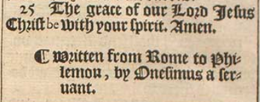 25 The grace of our Lord Iesus Christ be with your spirit. Amen.Written from Rome to Philemon, by Onesimus a seruant.