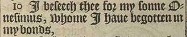 10 I beseech thee for my sonne Onesimus, whome I haue begotten in my bonds,