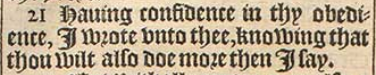21 Hauing confidence in thy obedience, I wrote vnto thee, knowing that thou wilt also doe more then I say.