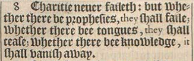 8 Charitie neuer faileth: but whether there be prophesies, they shall faile; whether there bee tongues, they shall cease; whether there bee knowledge, it shall vanish away.