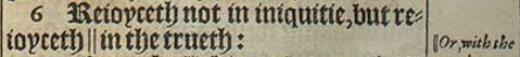 6 Reioyceth not in iniquitie, but reioyceth || in the trueth:[|| Or, with the trueth.]
