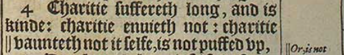4 Charitie suffereth long, and is kinde: charitie enuieth not: charitie ||vaunteth not it selfe, is not puffed vp,[||Or, is not rash.]