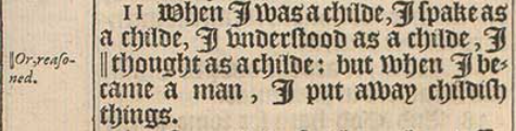 11 When I was a childe, I spake as a childe, I vnderstood as a childe, I ||thought as a childe: but when I became a man, I put away childish things.[|| Or, reasoned.]