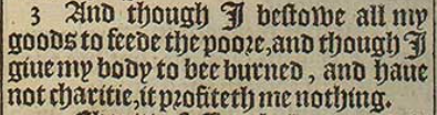 3 And though I bestowe all my goods to feede the poore, and though I giue my body to bee burned, and haue not charitie, it profiteth me nothing.