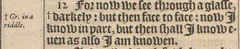 12 For now we see through a glasse, +darkely: but then face to face: now I know in part, but then shall I know euen as also I am knowen.[+Gr. in a riddle.]