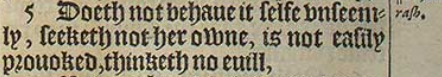 5 Doeth not behaue it selfe vnseemly, seeketh not her owne, is not easily prouoked, thinketh no euill,