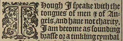 1 Though I speake with the tongues of men & of Angels, and haue not charity, I am become as sounding brasse or a tinkling cymbal.