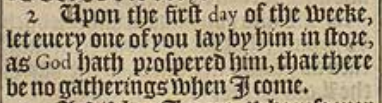 2 Upon the first day of the weeke, let euery one of you lay by him in store, as God hath prospered him, that there be no gatherings when I come.