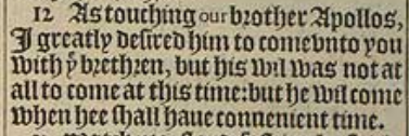 12 As touching our brother Apollos, I greatly desired him to come vnto you with þe brethren, but his wil was not at all to come at this time: but he wil come when hee shall haue conuenient time.