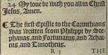 24 My loue be with you all in Christ Iesus, Amen. The first Epistle to the Corinthians was written from Philippi by Stephanas, and Fortunatus, and Achaicus, and Timotheus.
