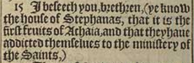15 I beseech you, brethren, (ye know the house of Stephanas, that it is the first fruits of Achaia, and that they haue addicted themselues to the ministery of the Saints,)