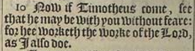 10 Now if Timotheus come, see that he may be with you without feare: for hee worketh the worke of the Lord, as I also doe.