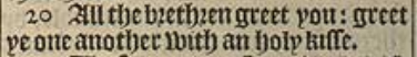 20 All the brethren greet you: greet ye one another with an holy kisse.