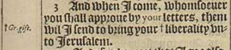 3 And when I come, whomsoeuer you shall approue by your letters, them wil I send to bring your +liberality vnto Ierusalem.[Gr. gift.]