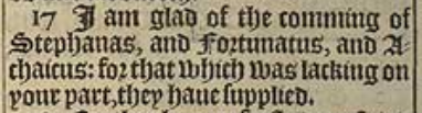 17 I am glad of the comming of Stephanas, and Fortunatus, and Achaicus: for that which was lacking on your part, they haue supplied.