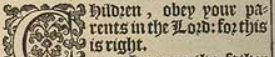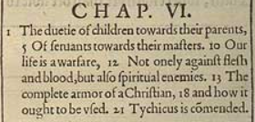 1 The duetie of children towards their parents, 5 Of seruants towards their masters. 10 Our life is a warfare, 12 Not onely against flesh and blood, but also spiritual enemies. 13 The complete armor of a Christian, 18 and how it ought to be vsed. 21 Tychicus is cōmended.