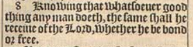 8 Knowing that whatsoeuer good thing any man doeth, the same shall he receiue of the Lord, whether he be bond or free.