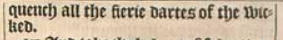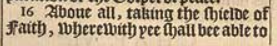 16 Aboue all, taking the shielde of Faith, wherewith yee shall bee able to quench all the fierie dartes of the wicked.