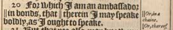 20 For which I am an ambassador ||in bonds, that || therein I may speake boldly, as I ought to speake.[||Or, in a chaine. , ||Or, thereof.]