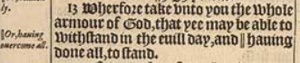 13 Wherfore take vnto you the whole armour of God, that yee may be able to withstand in the euill day, and || hauing done all, to stand.[||Or, hauing ouercome all.]
