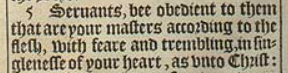 5 Seruants, bee obedient to them that are your masters according to the flesh, with feare and trembling, in singlenesse of your heart, as vnto Christ: