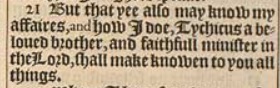 21 But that yee also may know my affaires, and how I doe, Tychicus a beloued brother, and faithfull minister in the Lord, shall make knowen to you all things.