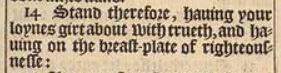 14 Stand therefore, hauing your loynes girt about with trueth, and hauing on the breast-plate of righteousnesse: