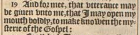 19 And for mee, that vtterance may be giuen vnto me, that I may open my mouth boldly, to make knowen the mysterie of the Gospel: