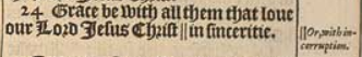 24 Grace be with all them that loue our Lord Iesus Christ || in sinceritie. Written from Rome vnto the Ephesians by Tychicus.[Or, with incorruption.]