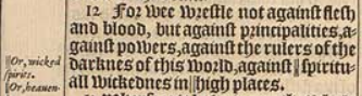 12 For wee wrestle not against flesh and blood, but against principalities, against powers, against the rulers of the darknes of this world, against ||spirituall wickednes in ||high places.[||Or, wicked spirits. , ||Or, heauenly.]