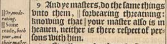 9 And ye masters, do the same things vnto them, || forbearing threatning: knowing that || your master also is in heauen, neither is there respect of persons with him.[||Or, moderating. , ||Some reade, both your, and their master.]